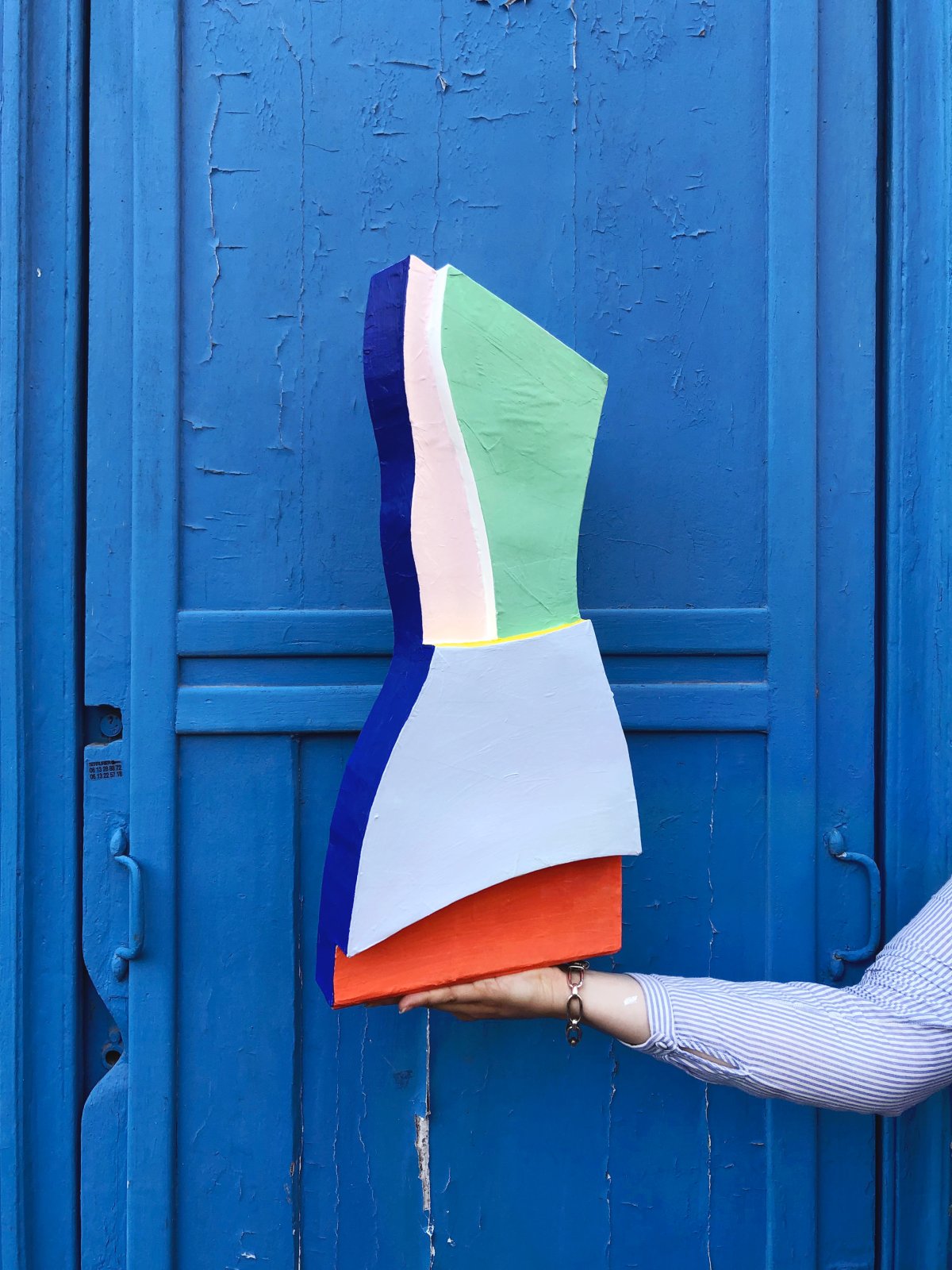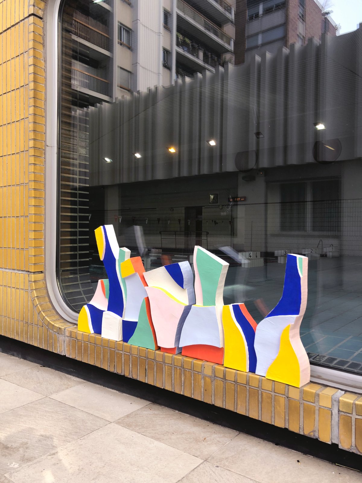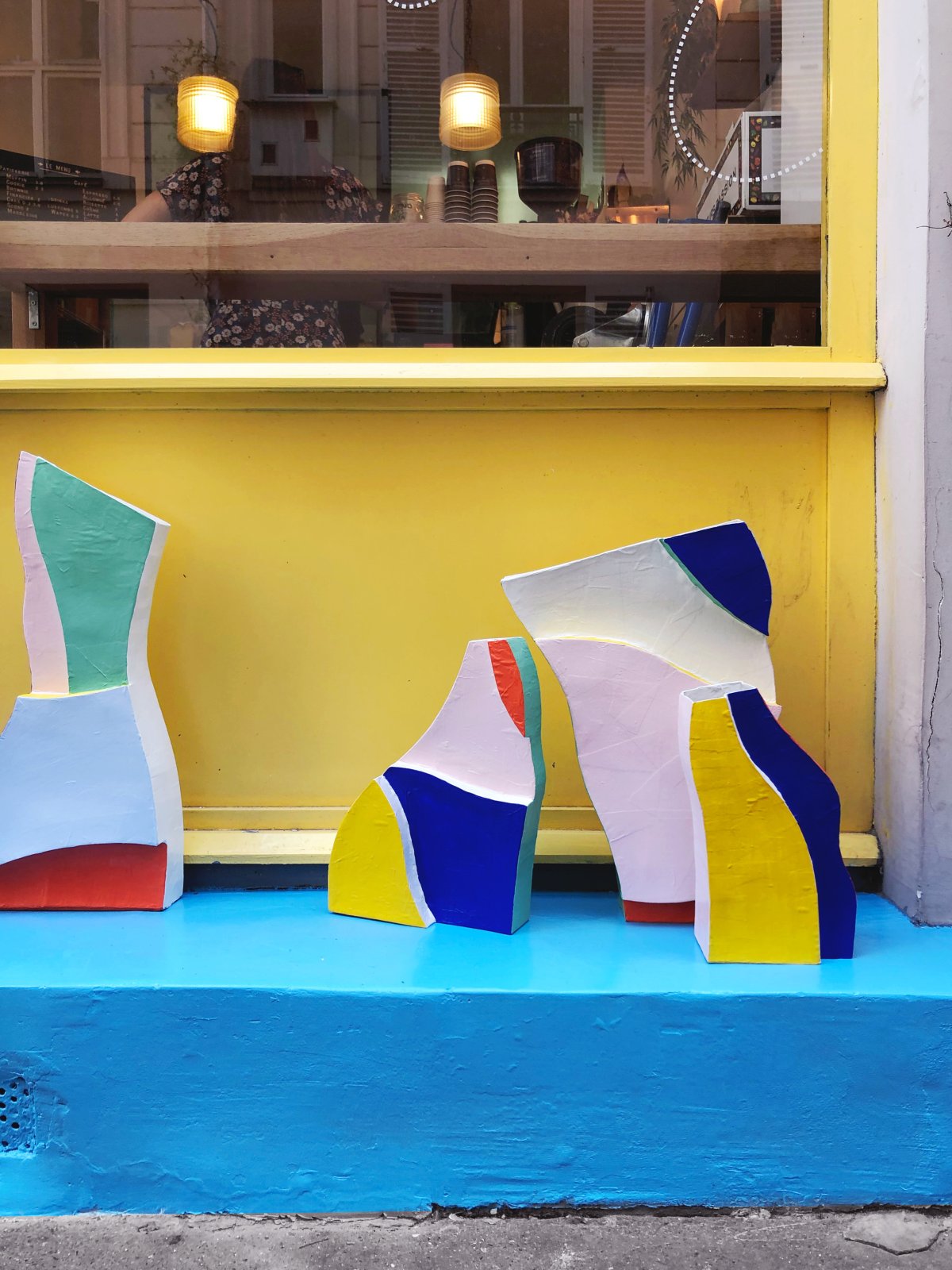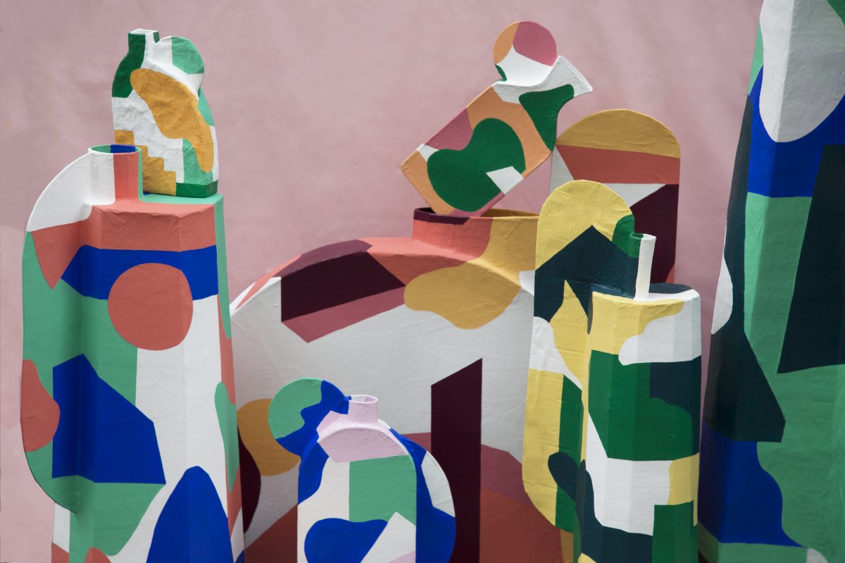 Imaginés comme un tableau, ces 7 vases sont réalisés en papier mâché. Sur différents plans, les couleurs viennent dialoguer et prendre place dans l'espace.